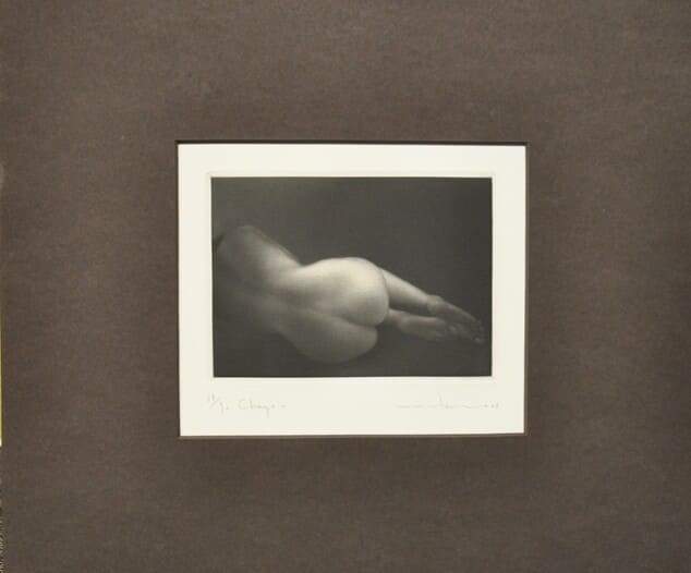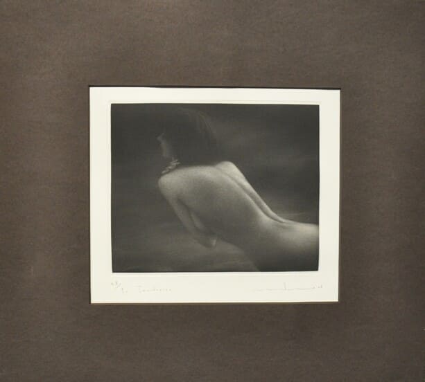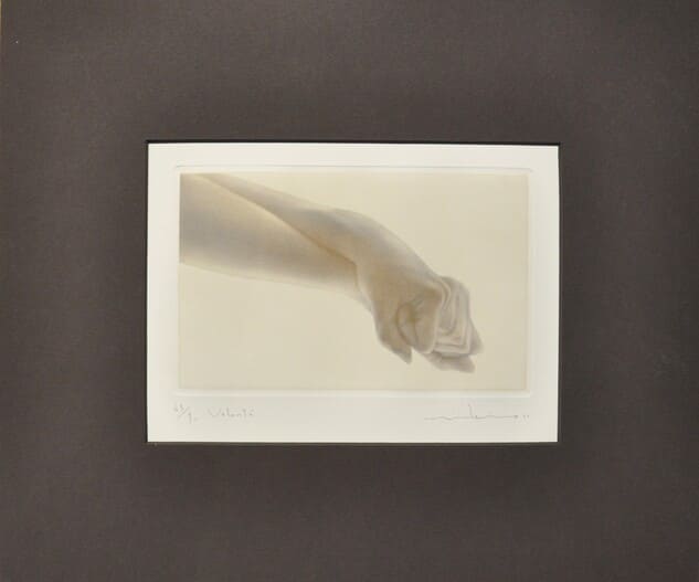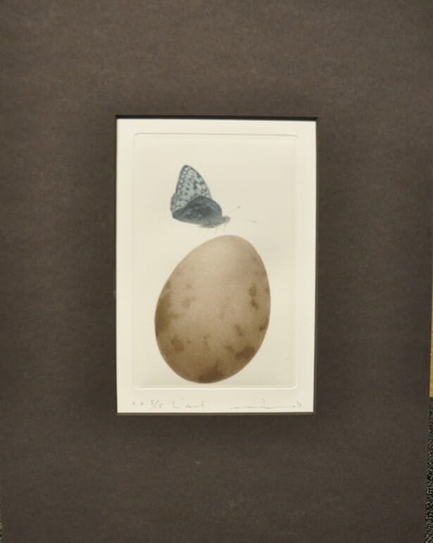Pour parvenir au degré d’expressivité souhaité à partir d’une interprétation naturaliste du sujet, il crée ses propres outils, une variété de berceaux de toutes les tailles, adaptés à chaque composition. …. Si le corps féminin, dont Watanabé célèbre la grâce et le mystère, demeure son sujet favori, il s’est tourné vers la nature depuis son installation en Bretagne en 1999. Plus qu’aucune autre technique de gravure, la manière noire permet le rendu tactile de l’épiderme, du velouté de la peau. Une série de nus rend compte de ce savoir, qui ne vaut que par une sensibilité charnelle qui dispense la lumière enveloppante sur une chute de reins, un dos, alors que l’ombre semble submerger une partie du corps. , confie l’artiste. Il le prouve avec une série inédite sur les insectes, les poissons, les grenouilles, les fleurs, les papillons. Enchanté par la vie qui se cache en chacune de ces créatures, la plus humble soit-elle, il tente d’en fixer la secrète beauté, comme sa complexité anatomique. C’est en poète entomologiste que le graveur dissèque la coloquinte, les ailes du papillon. ….. Le regard appelle la main. On se laisse prendre au trompe-l’œil, si éloquent. La pertinence graphique est épaulée par un jeu de miroir en prise sur le cache d’un faux cadre.